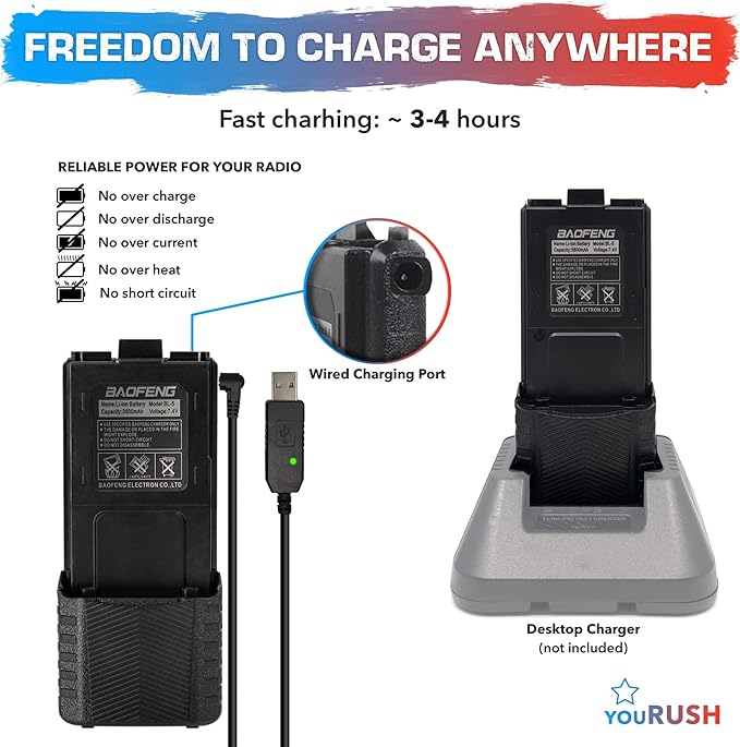 - LONG LASTING BATTERY: 3800 mAh battery delivers extra life your radio needs. Holds a charge more than two times longer vs standard. 3-4 hour rapid charging. Battery saver function. Time out timer. Stay connected for up to 5 days! Baofeng UV-5R battery BL-5 3800mAh gives you smooth operation of your favorite two way radio! And with USB charging cable you can charge your Baofeng battery everywhere.