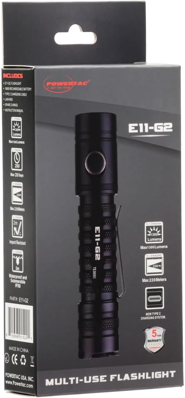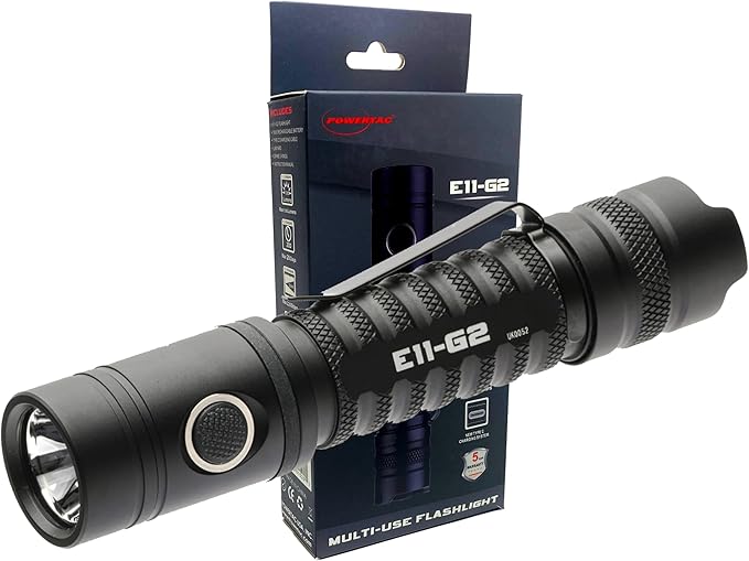 - The Powertac E11-G2, a versatile everyday carry flashlight, boasts a powerful 1300 lumen output, dual switch interface, and durable design. It's perfect for everyday tasks, professional work, and outdoor adventures, offering improved visibility. Ideal for nighttime walks, reading, or household chores.