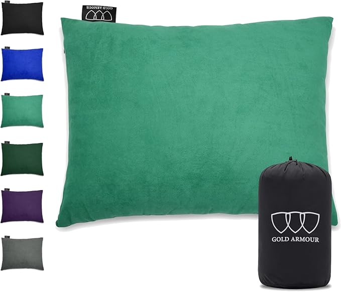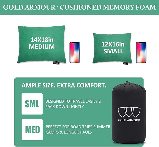 - COMFORTABLE: Our Gold Armour pillow is stuff with cushioned memory foam and wrapped in a soft, micro-suede cover. This travel pillow gives you a well deserved supportive rest that your head and neck will thank you for! Our compressible pillow can also be used as a seat cushion too