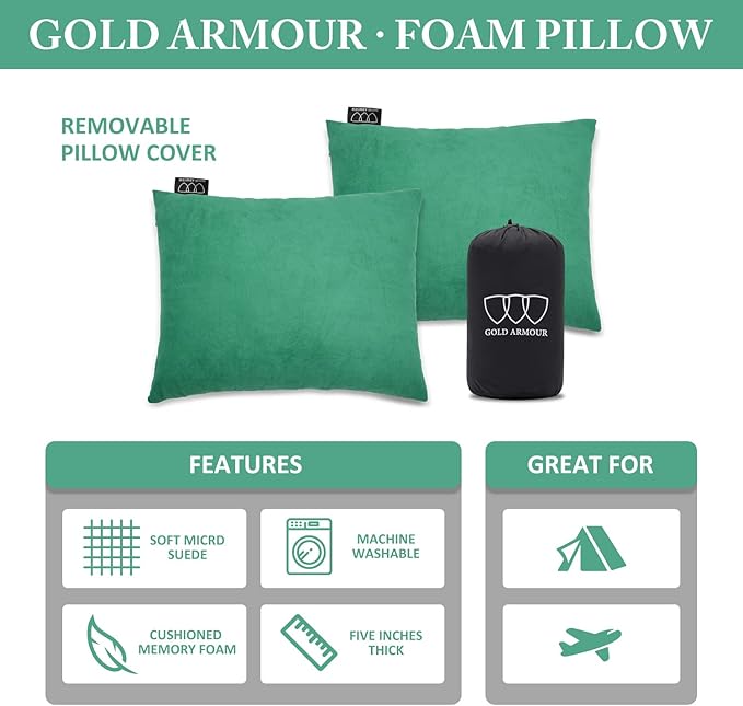 Gold Armour Camping Pillow Memory Foam - Compact Compressible Backpacking, Hammock, and Travel Pillows for Kids and Adults - Essential Outdoor & Camping Gear (Medium 14x18in, Seafoam)