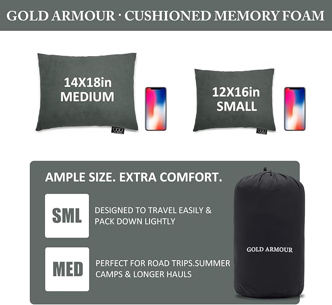 Gold Armour Camping Pillow Memory Foam - Compact Compressible Backpacking, Hammock, and Travel Pillows for Kids and Adults - Essential Outdoor & Camping Gear (Small 12 x 16in, Gray)