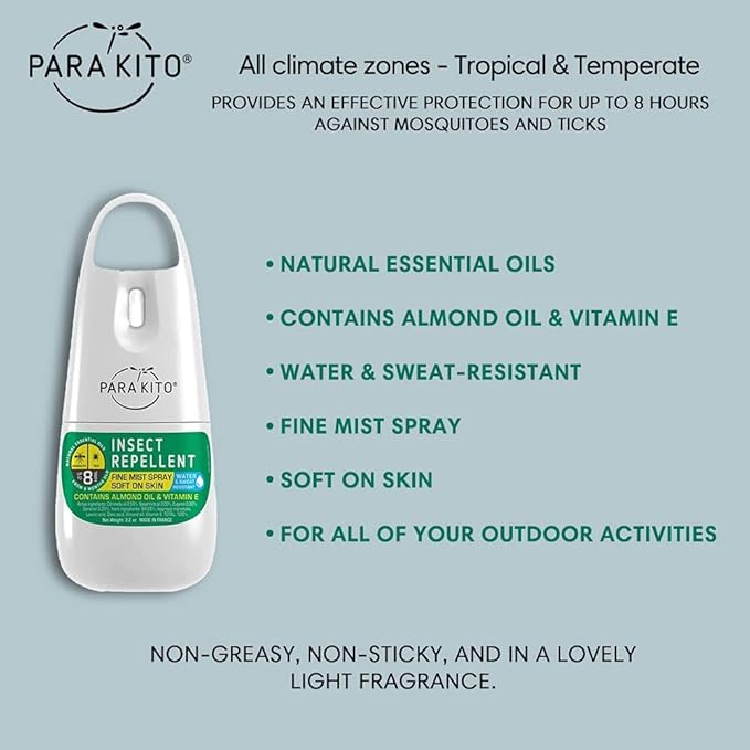 - LOVELY LIGHT FRAGRANCE: PARA’KITO fine mist spray comes in a cool refreshing scent that is DEET-free, paraben-free, phthalate-free, & never tested on animals.