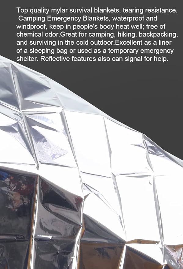 - MULTIFUNCTIONAL - This emergency blanket survival gear is waterproof, moisture-proof, and UV-proof, with high temperature and low temperature resistance. It is very suitable as a outdoor gear for both men and women for such activities as hiking, camping, backpacking and mountaineering. Our thermal blankets can be used as ground covering, sleeping bag liner, emergency poncho, emergency tent, car blanket, camping tarp against wind and rain, etc.
