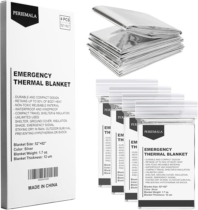 - MYLAR EMERGENCY BLANKETS (Silver) (Pack of 4)- Each survival blanket is individually folded, wrapped, and sealed for easy storage and retrieval. They are reusable, waterproof and windproof and can also be used for both ground cover and shade. Durable and advanced aluminized dual-sided Mylar blankets are perfect for conserving body heat in emergency survival situations.