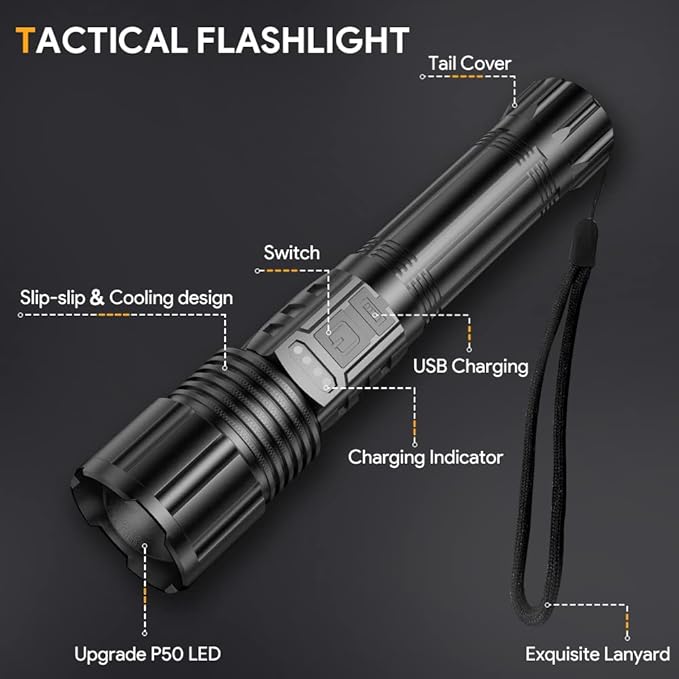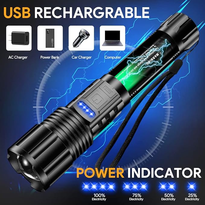 - 🔦【USB rechargeable flashlight】This rechargeable flashlights, using USB smart fast charging, and equipped with Android USB cable, compatible with a variety of devices, such as: car, notebook, mobile power, etc.; there are four blue indicator lights on the tactical flashlight, Respectively indicate different power levels: 100%-75%-50%-25%, allowing you to charge in time to avoid the sudden loss of power to the flashlight.