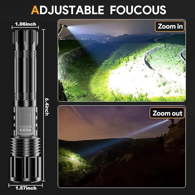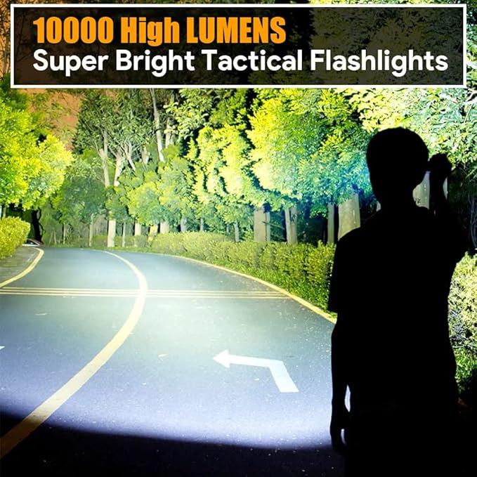 - 🔦【Excessive&long-lasting】This tactical flashlights uses a super bright upgraded 7th generation wick, with a lumens of up to 10000, equipped with high current output, the brightness is more remarkable, and the use of advanced convex lens sheets, easy to achieve ultra-long beam and large aperture switching , In addition, this flashlight is also equipped with a 3000 mAh rechargeable battery, which has a longer battery life. In low light conditions, the use time is up to 12 hours.