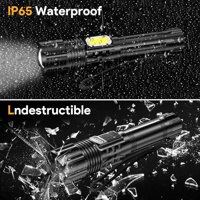 - 🔦【Rugged & Waterproof】 This flashlights for emergencies is almost indestructible. It is made of military-grade aluminum developed in cooperation with foreign technology. It can withstand a 10-foot drop; and we have greatly improved the sealing setting of the flashlight, which can effectively prevent rain. Immersed into the flashlight, it can be used normally even in rainy weather. (Does not support soaking in water)