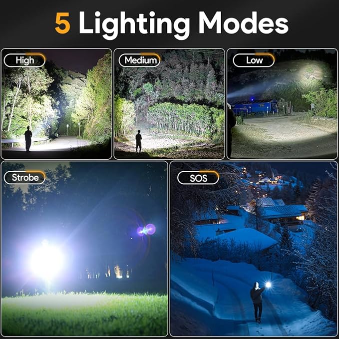 - 🔦【Suitable for many occasions & has five modes】When Working, walking the dog, camping, or expedition, emergency lighting, etc., you can bring it, and you will not be in the dark at any time. In addition , This tactical flashlight has the same settings as the 5 tactical lights used by the US Special Forces! (Low | Medium | High | SOS | Strobe) The beam width can be adjusted as desired.