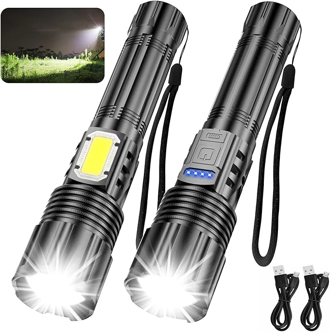 2 Pack Rechargeable Flashlights 10000 High Lumens with Cob Sidelight,Waterproof,Zoomable,5 Modes,LED Flashlight for Emergency Camping Hiking(with Battery)