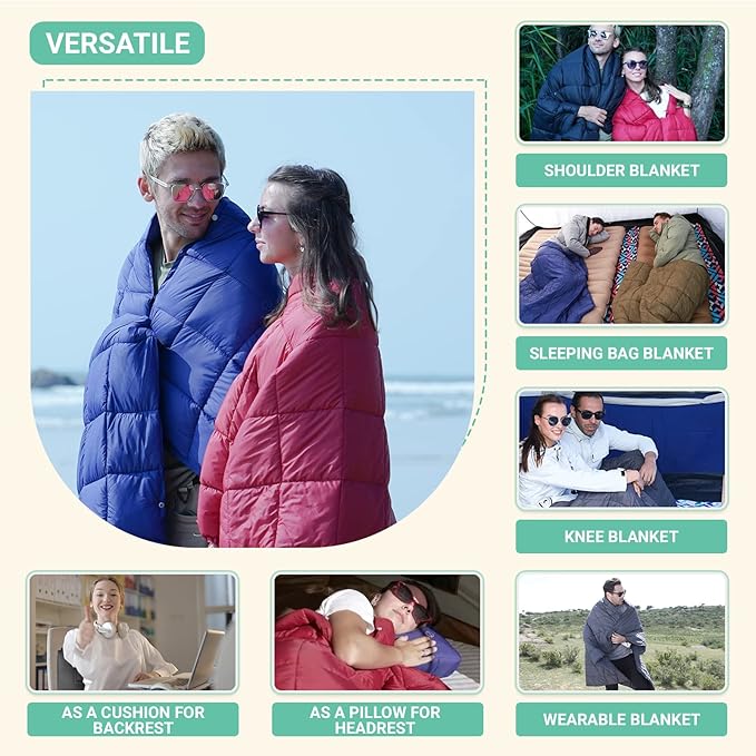 - 3-IN-1 DESIGN- You can use the waterproof puffy outdoor blanket/quilt as a poncho by clicking the buttons. When packed into the storage bag, camping stuff sack puffy blanket can be used as a small cushion or a pillow. In an emergency, puffy outdoor camping blanket can also be used as a simple sleeping bag.