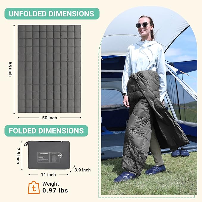 - WATER REPELLENT & DURABLE- kingcamp puffy blanket is made of 20D ripstop nylon, which is water repellent and can support your daily use for a long time. The surface of compact travel blanket prevents dirt or stains.