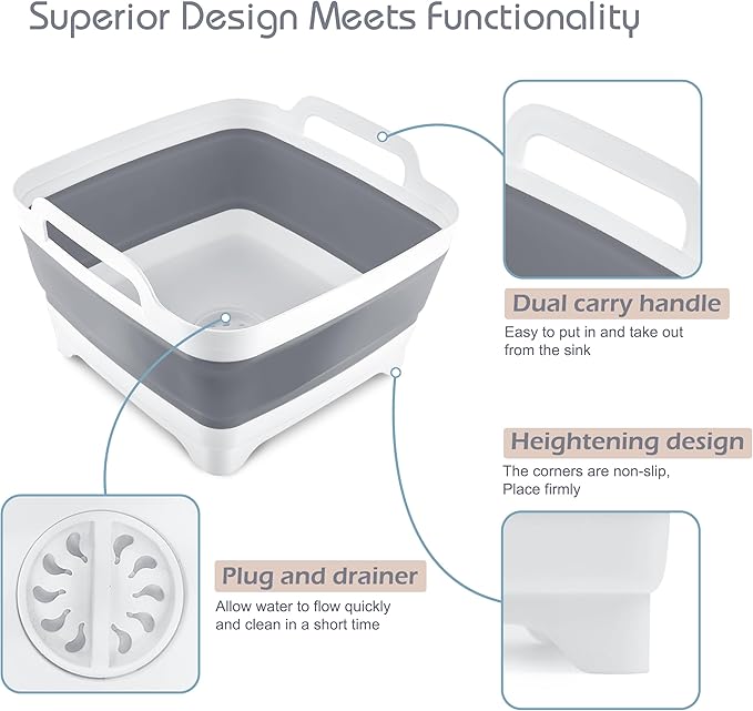 - 【Plug & Drainer Design】The portable kitchen sink and camping sink basin come with a removable drain plug that you won't lift to drain. The collapsible dish drainer is suitable for washing dishes, bowls, vegetables, and pump parts.