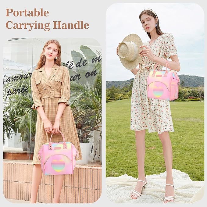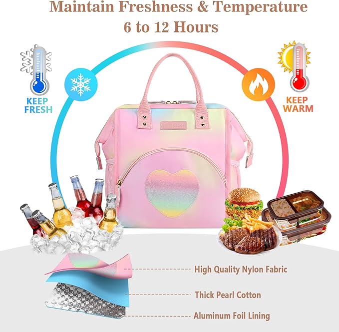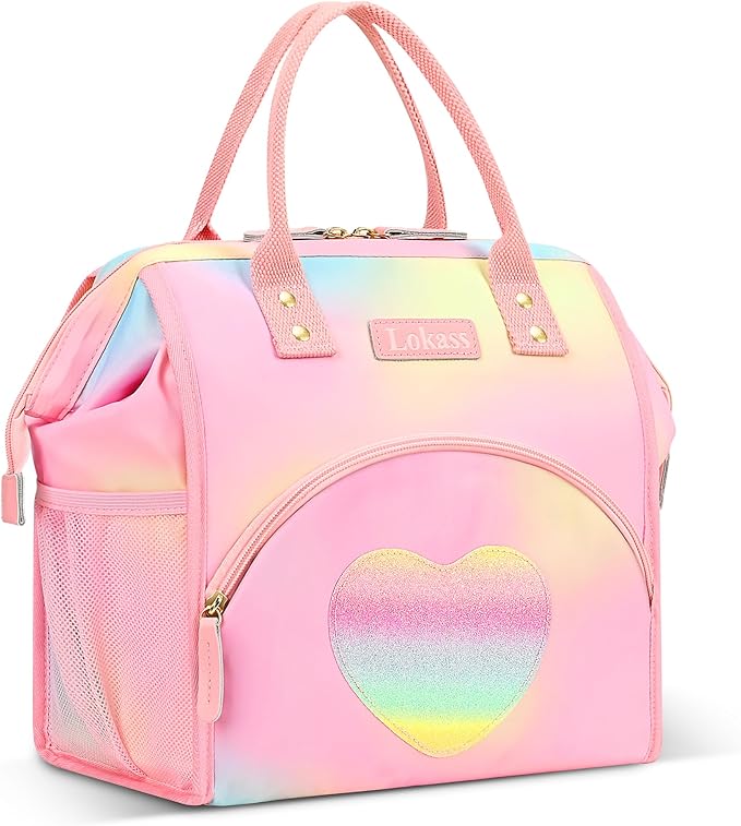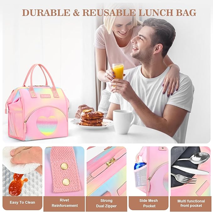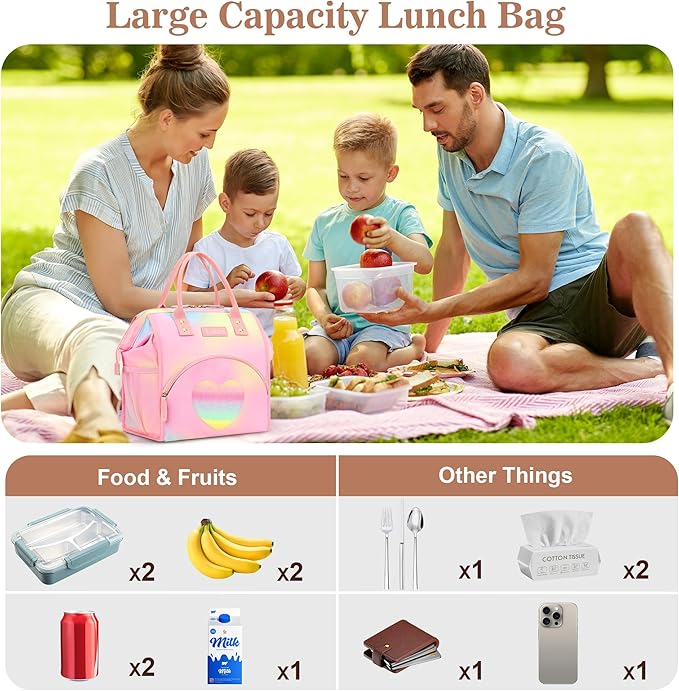LOKASS Lunch Bag Insulated Lunch Box Wide-Open Lunch Tote Bag Large Drinks Holder Durable Thermal Snacks Organizer for Women Adults Work Picnic Hiking Beach,Heart Colorful