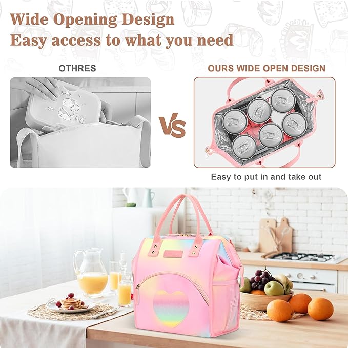 - Wide Open Design - The top can be opened up to 10"L x 6"W and stay opening itself due to the metal frame, that means your lunch container can be accessed the bag HORIZONTALLY. Wide open design can prevent the liquid from leaking out of the container and soiling inside of the bag. Save your cleaning time.