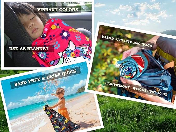 - WIDE USE - This is more than just a gorgeous beach bath towel and soft portable blanket. It is suitable for use at home, beach, pool, swimming, picnic, sleepover, travel, vacation, cruise, exercise, gym, fitness, camping, hiking, yoga, outdoor, water park, tennis, sports, sporting events, etc. It is a multi-purpose towel and a wonderful gift for little ones.