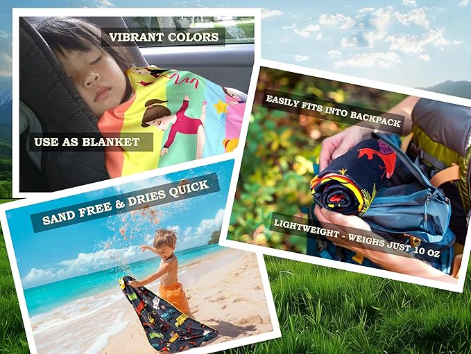 - WIDE USE - This is more than just a gorgeous beach bath towel and soft portable blanket. It is suitable for use at home, beach, pool, swimming, picnic, sleepover, travel, vacation, cruise, exercise, gym, fitness, camping, hiking, yoga, outdoor, water park, tennis, sports, sporting events, etc. It is a multi-purpose towel and a wonderful gift for little ones.