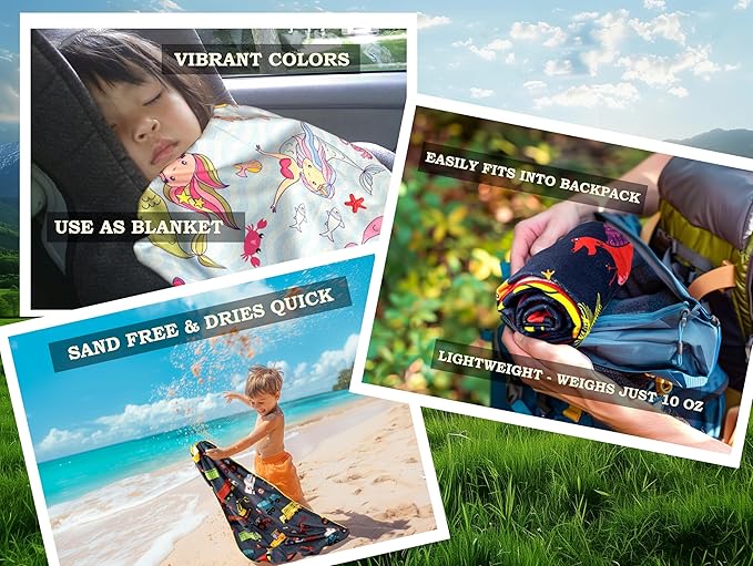 - WIDE USE - This is more than just a gorgeous beach bath towel and soft portable blanket. It is suitable for use at home, beach, pool, swimming, picnic, sleepover, travel, vacation, cruise, exercise, gym, fitness, camping, hiking, yoga, outdoor, water park, tennis, sports, sporting events, etc. It is a multi-purpose towel and a wonderful gift for little ones.