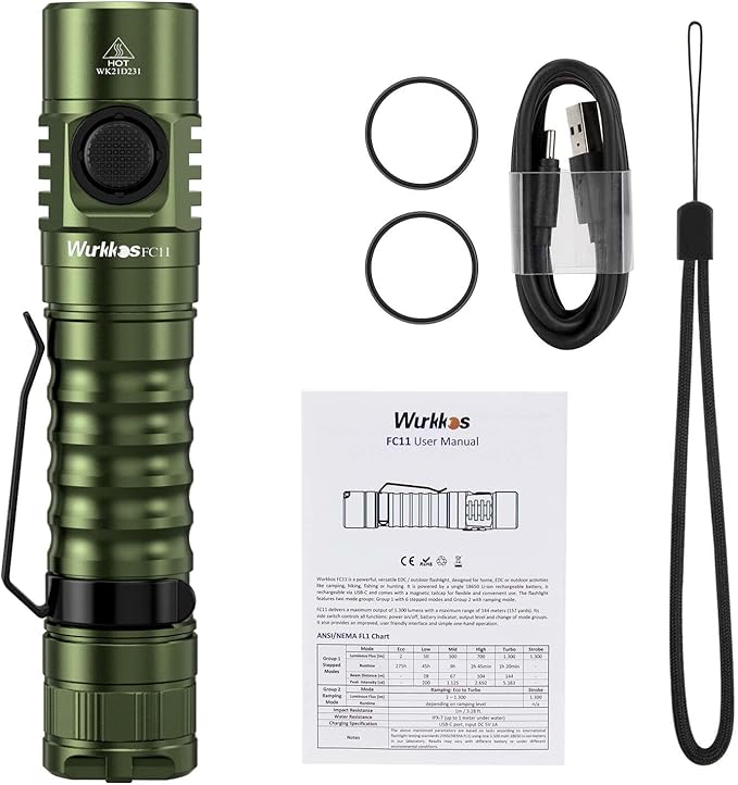 Wurkkos FC11 Rechargeable LED Flashlights Max 1300Lumen High 90CRI EDC Flash Light USB C Charge,IP67 Waterproof Torch, Magnetic Tailcap, Great for Dog Walking Home use Emergency(Green-4000K)