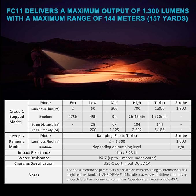 - Super Bright Light: FC11 uses 1* LH351D high 90 CRI LED(The Sun:100 CRI). Output up to 1300 lumens (max.), beam distance up to 144 meters(157 yards). The LED has a natural white light color with good color rendering. You can see every detail even in complete darkness.
