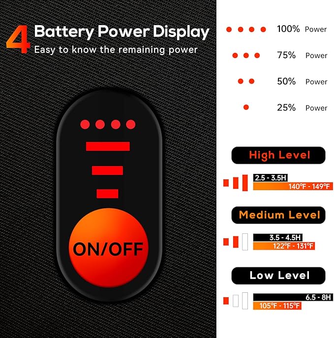 - 【Safer & Longer Battery】Compared with others' 5V battery(Actual 3.7V), our 7.4V rechargeable lithium battery provides faster heating speed and better performance at low temperature, and higher energy(7.4V*3000mAh=22.2Wh) brings up to 8 hours warmth(At low level&full charge). In all, our UL,FCC,CE certified battery keeps you warmer and safer.