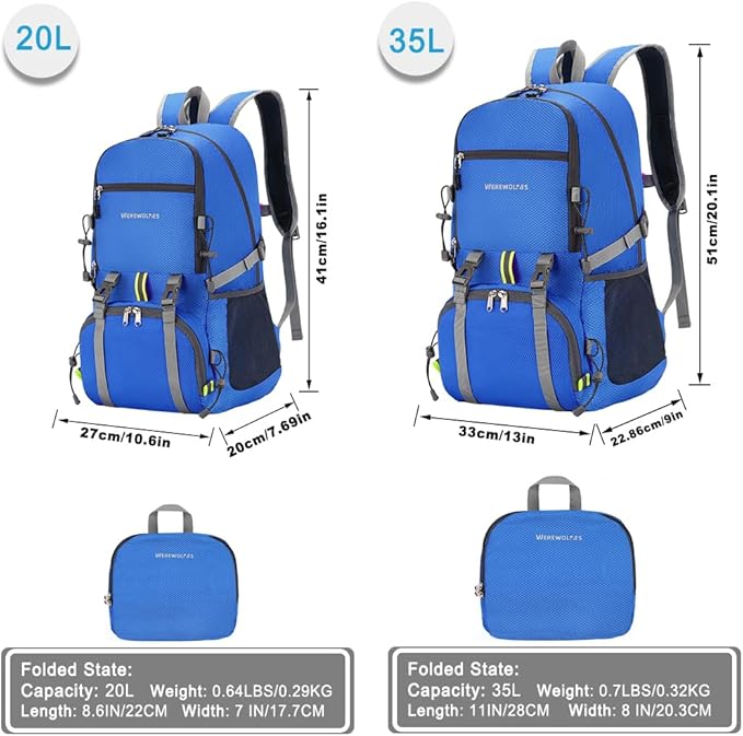 WEREWOLVES 20/35L Lightweight Hiking Backpack, Ultralight Water Resistant Packable Daypack for Women Men