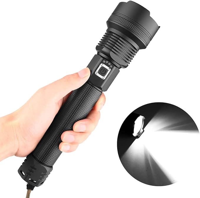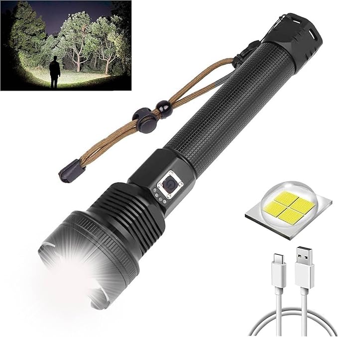 - 【Widely applicable】This Super Bright XHP70 rechargeable flashlight comes with powerful rechargeable cable.The portable size and comfortable hand rope make it easy to carry on,Professional LED Flashlight Perfect for camping,police,hunting,hiking,fishing,hand lamp,cycling,climbing,reading,walking,running,etc.