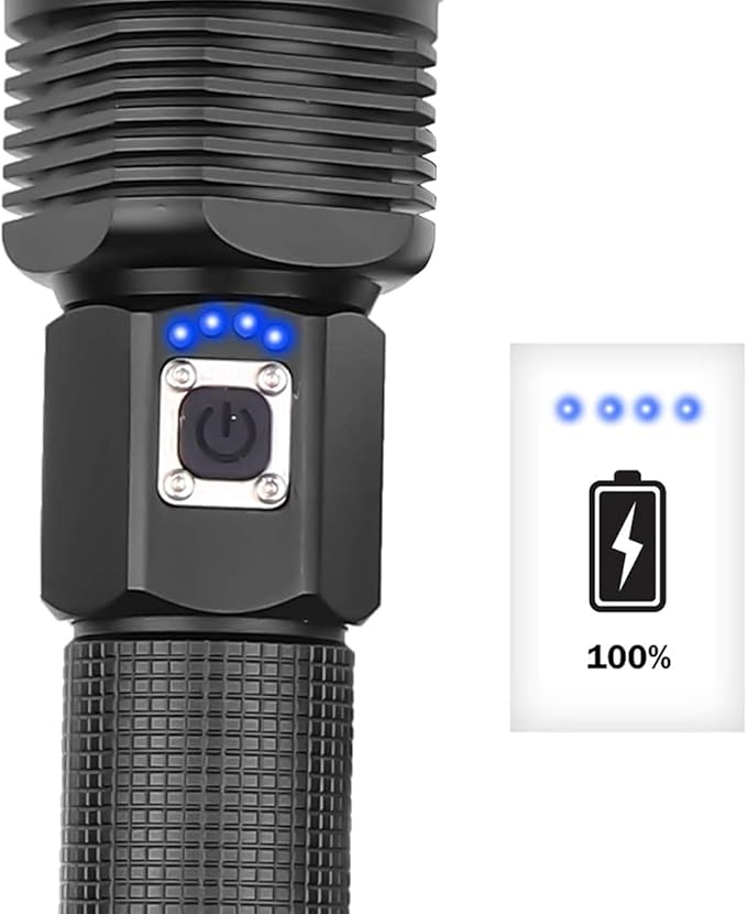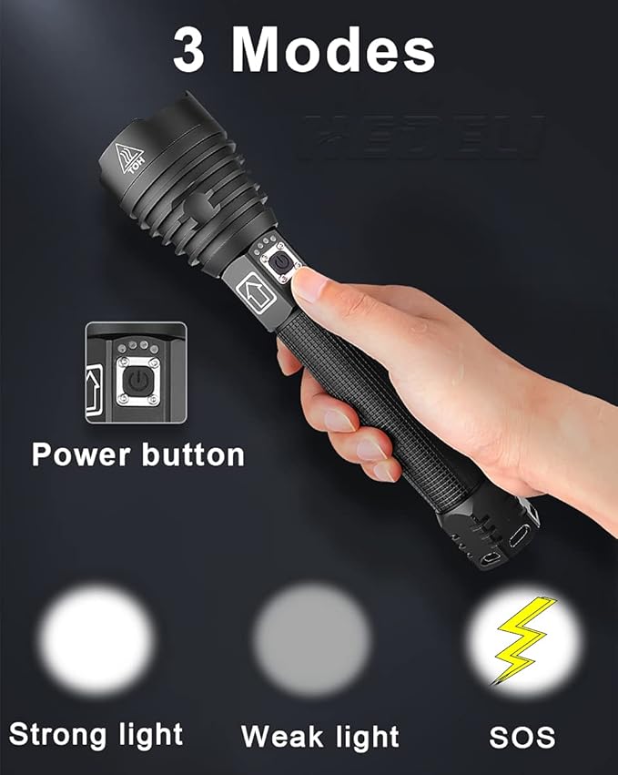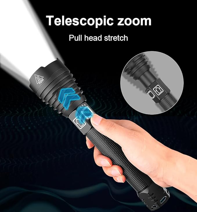- 【Super Bright & Long-Lasting】With HXP70 LED chip,Flash Light produces 1200000 lumens of brightness and the beam distance is up to 500 yards,it can last 3 hours when on the high brightness mode.Stable and bright light,illuminating your night.Suitable for home and outdoor use.It can be used as a long-distance outdoor flashlight.