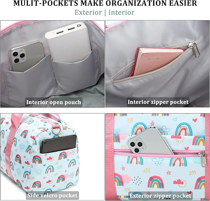 - 【WEAR IT YOUR WAY】: The sleeve on the back of the duffle bag fit it in trolley case. And one zippered pocket on the back to hold small stuffs. Each girls overnight bag comes with detachable shoulder strap, for those times when they want to sling it over their shoulder and be on their way. The duffle bag also has durable padded handle at the top for a hand-held design.