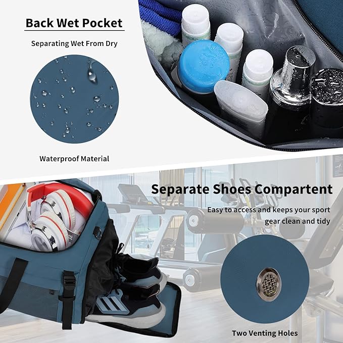 - Dry & Wet Compartment Separation: This gym tote delivers spacious storage with 1 large main zippered compartment for dry & clean clothes or everything for gym & traveling you necessary, and 1 upgraded waterproof PVC lined pocket (20" x 13") with zipper for wet items alongside the main compartment, in addition.