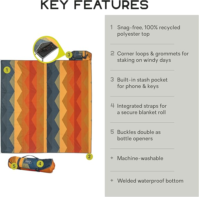 - Packs up into a secure, tidy blanket roll with an aluminum closure that doubles as a bottle-opener and a convenient handle for easy carry.