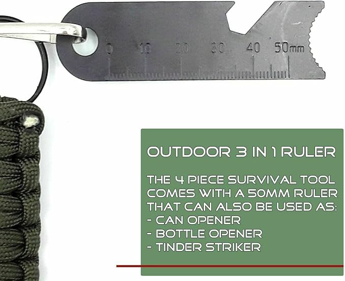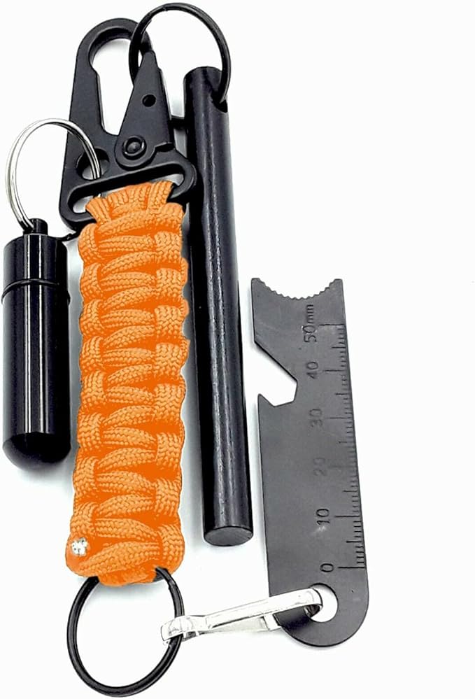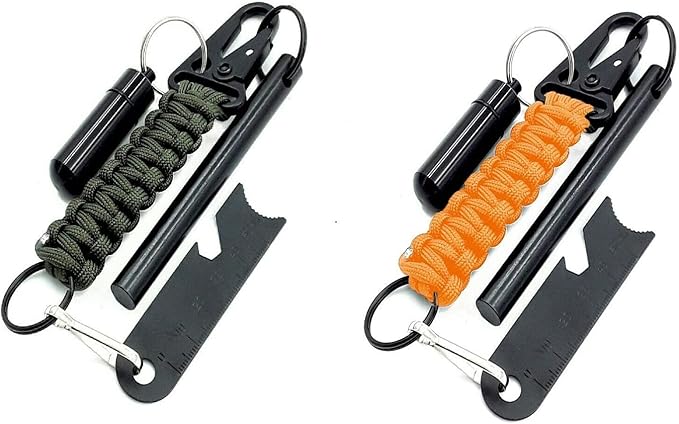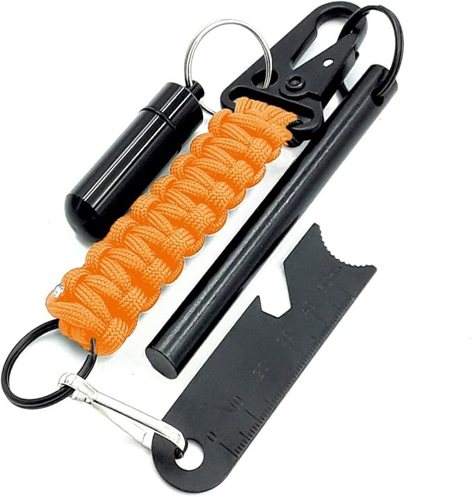 - EVERYTHING YOU NEED: Your set includes a Ferro Rod 3/8” thick with striker, 5 Feet of Paracord, Map Ruler, Bottle Cap Opener, Cotton Tinder in O-ring Sealed Carrier Tube, Key Ring and Attachment Clip