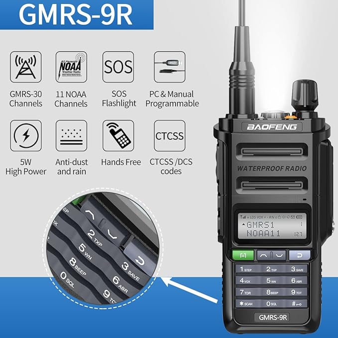 - IP67 Waterproof Features:9R Plus upgrade version,The GMRS Radio with better waterproof and dustproof capabilities(Not diving),can meet the needs of outdoor sports, camping, mountaineering etc in the bad weather, which ensures the reliability of the walkie-talkie in wet environments.