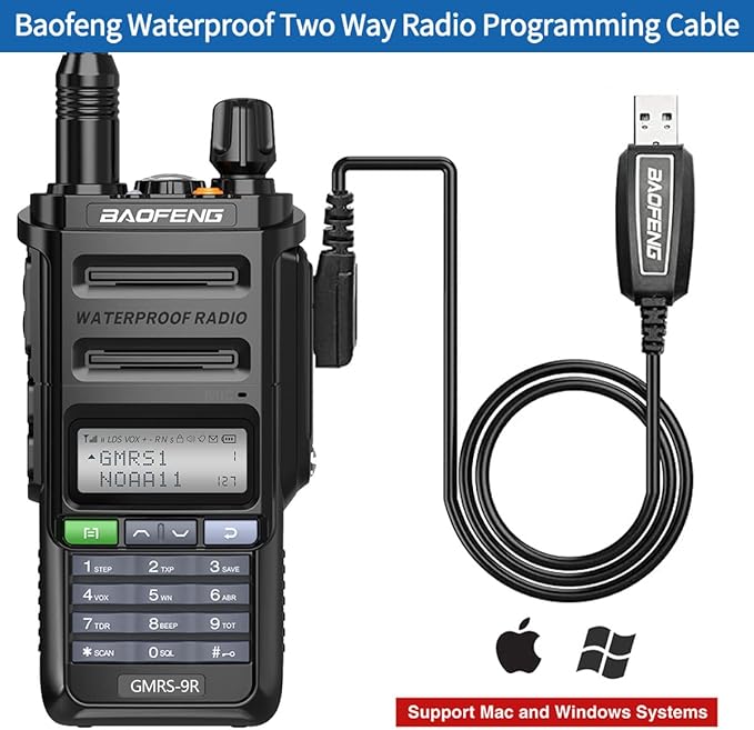 - Professional GMRS Radio:GMRS-9R has 30 GMRS channels + 11 NOAA weather channels,You can easily add new channels and change settings on the go by the PC and keypad menu programs, 155 Privacy Codes (50 CTCSS codes/ 104 DCS codes) ,Reduce interference. FFC ID: 2AJGM-P52UV.Note: In order to meet the FCC requirements, Baofeng will upgrade the GMRS-9R series of walkie-talkies, and the radio will not have FM radio function.