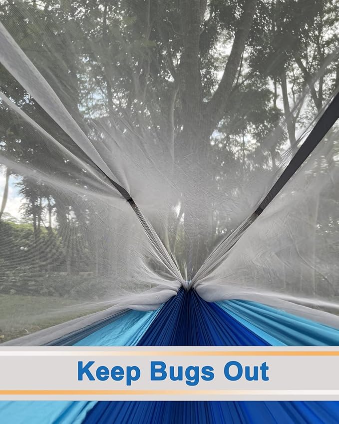 • Upgraded Camping Hammock Installation: Say goodbye to complicated installation method,our camping hammock has 2 adjustable ropes with hook,just carry the rope then connect the hook with tree straps.Upgraded net is more dense and durable which can effectively stop the bites and harassment of insects.Extra large space can give you maximally comfortable,have a snuggle, stretch out or even have your pets with you in our hammocks