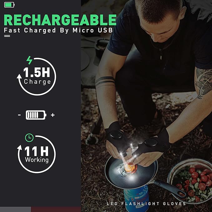 - 🎀The Rechargeable Flashlight Gloves: The ordinary flashlight gloves on the market are all replaceable battery powered.We launched this pioneering rechargeable flashlight gloves. Recharge & reuse the LED torch.10-hour runtime upon a 2-hour recharge.