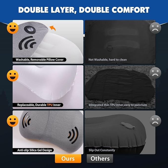 - 𝐌𝐀𝐊𝐄 𝐀𝐈𝐑 𝐋𝐄𝐀𝐊 𝐈𝐌𝐏𝐎𝐒𝐒𝐈𝐁𝐋𝐄: Unlike those traditional integrated air pillows which can easily develop a leak and become useless, our camping pillow for backpacking consists of a machine washable foam pillowcase and a removable air bladder which is made of premium thickened TPU to prevent air leaks effectively. Assure you a clean and luxurious night sleep outdoors