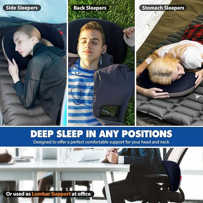 - 𝐒𝐀𝐘 𝐆𝐎𝐎𝐃𝐁𝐘𝐄 𝐓𝐎 𝐎𝐔𝐓𝐃𝐎𝐎𝐑 𝐒𝐋𝐄𝐄𝐏𝐋𝐄𝐒𝐒 𝐍𝐈𝐆𝐇𝐓𝐒: Looking for a camping pillow which not only can provide a perfect comfortable support for your neck and head, but also so light and compact to carry on the go? Well, here is your new inflatable pillow. Designed with a soft, breathable cover and ergonomic construction, our backpacking pillow will provide maximum comfort and let you have a restful sleep under stars!
