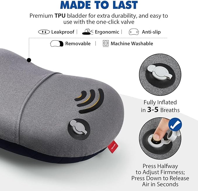 - 𝐓𝐇𝐄 𝐏𝐄𝐑𝐅𝐄𝐂𝐓 𝐏𝐈𝐋𝐋𝐎𝐖𝐒 𝐅𝐎𝐑 𝐀𝐋𝐋 𝐒𝐋𝐄𝐄𝐏𝐄𝐑𝐒: No matter which types of sleepers you are, Hikenture camping pillows for sleeping with the adjustable firmness were designed for your sleep position! Thanks to the patented one-click valve, our blow up pillow only takes 3-5 breaths to fully inflate. Press down the black button of the valve to release air in seconds, and press halfway to adjust the hiking pillow to your favorite firmness.