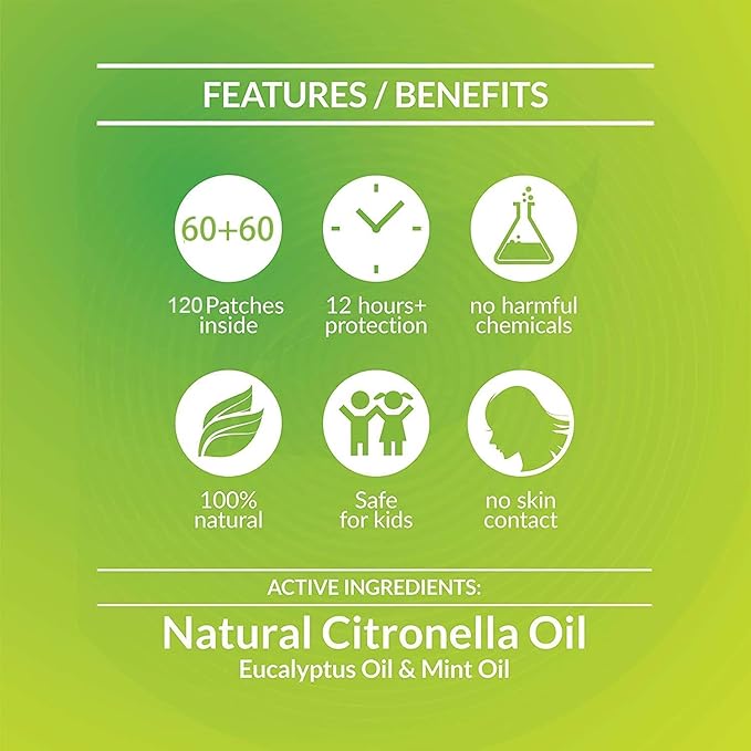- CITRONELLA PATCH: Made of natural ingredients, Infused with citronella oil, Our mosquito patches keep away the mosquitoes naturally and effectively by emitting a citronella aroma.