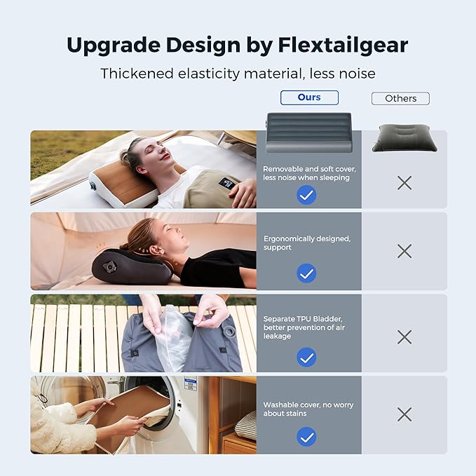 - 【EASY to INFLATE & DEFLATE】: Inflate pillow by mouth with approximately several breaths. Deflate feature which rapidly releases air after use in only seconds. Ultimate backpacking gear for Camping, hiking, hammock, RV, airplane, couch. Almost all of Flextailgear air pumps can be inflated to the travel pillow