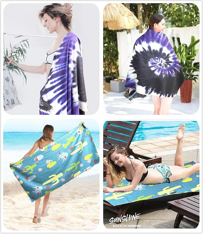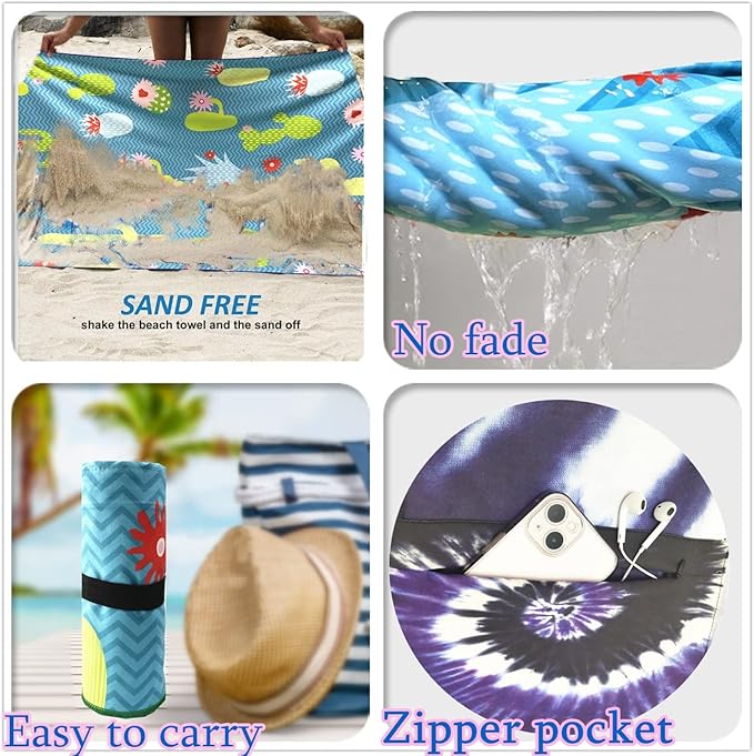 - 【SAND FREE CONVENIENT TO CARRY】:Amazing micro beach towel ! It’s lightweight and folds up small which is a huge space saver when trying to pack light for the beach. It’s sand resistant too.Our no sand beach towel have many patter for you choice,such as elphant beach towel,mermaid beach towel,flamingos beach towel,tie dye beach towel,Dinosaur microfiber beach towel