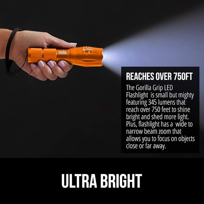 Gorilla Grip Powerful LED 750 FT Water Resistant 5 Adjustable Mode Tactical Flashlight, High Lumens Ultra Bright Battery Zoom Flashlights, Small Camping Car Mini Flash Light Accessories, 2 Pack Orange