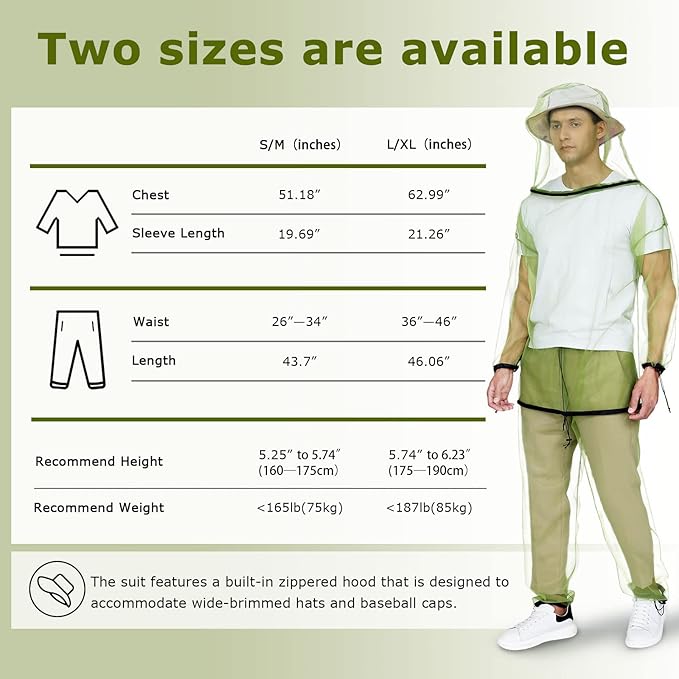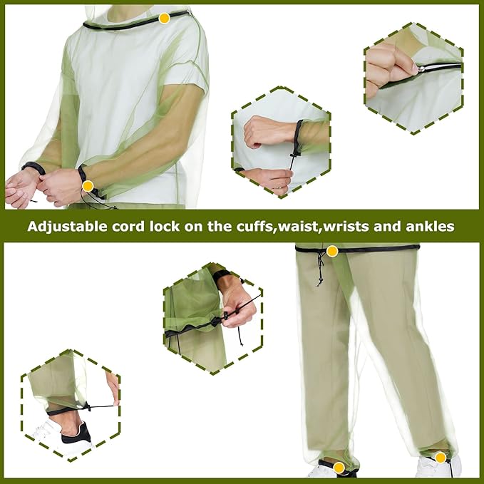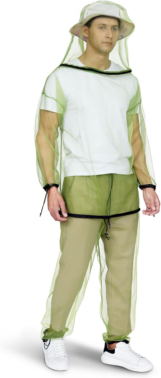 - TRAVEL COMPANION - This mosquito suit is the perfect travel companion. The included carrying pouch ensures easy storage and transport wherever you go. Don't let bugs ruin your trip - pack this mosquito suit set and enjoy your travels with peace of mind.