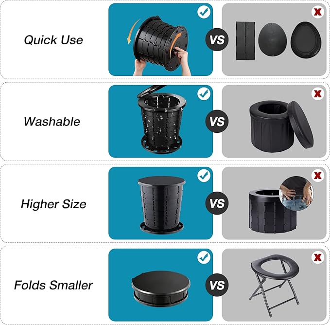 - 【STURDY & DURABLE】 Modified ABS plastic material, 70 locked buckles and non-slip bases make the toilet remarkable stability and durability. Load capacity reaches 380 lbs far more than others. Providing a safe, compact and comfortable travel toilet is always what we want to do for our customers around the world.