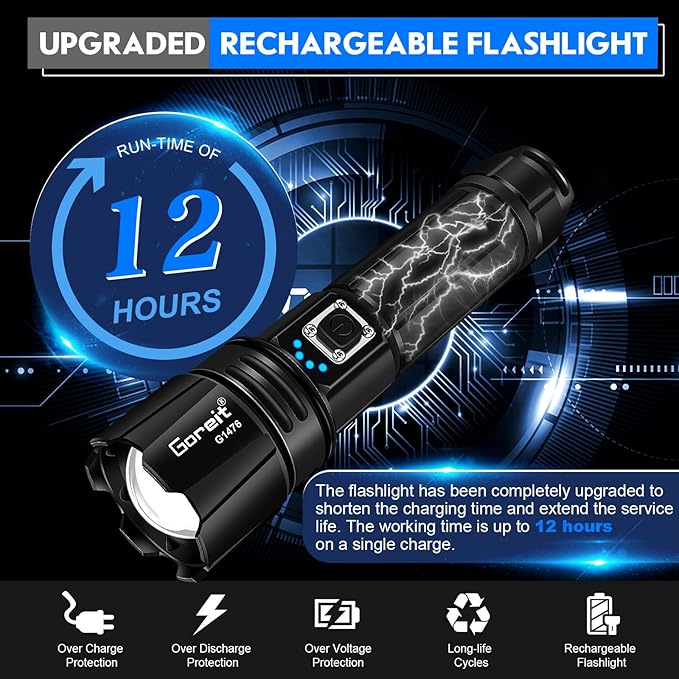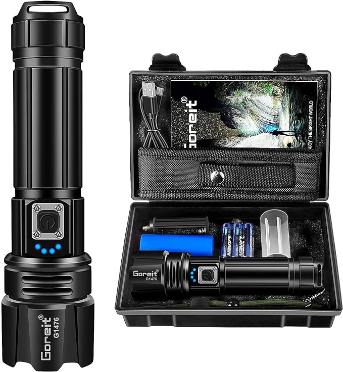 - 【950000 LUMEN LED FLASHLIGHT】: Goreit flashlights high lumens utilizes upgraded XHP70.2 LED, which is stable and super bright and provides an incredibly powerful lighting, 10 times brighter than other normal led flashlights. A 120 square meter room can be illuminated without any problems, you can also focus on objects up to 1640FT away. This flashlights high lumens rechargeable is an ideal gift for mate, family, friends,colleagues, etc.