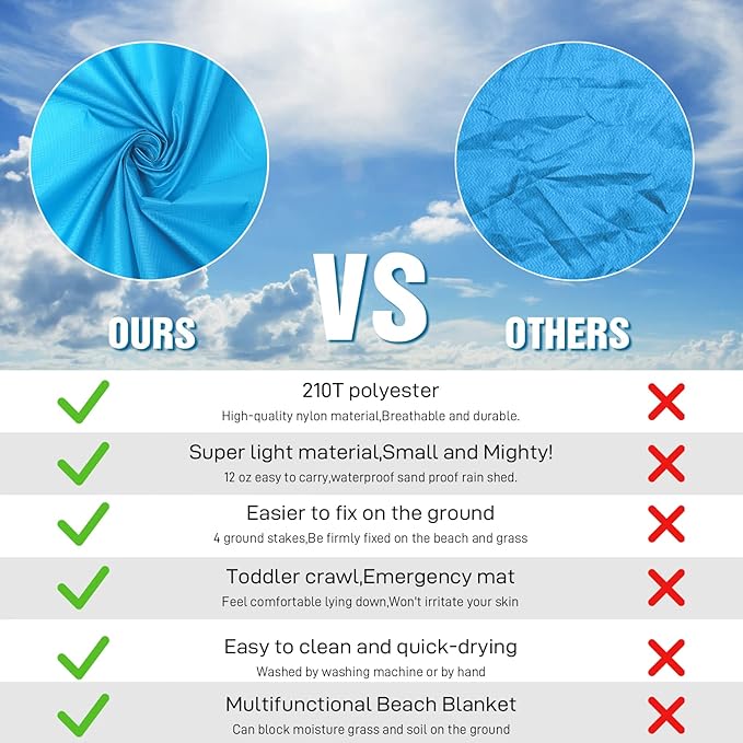 - 🏕️Beach Blanket Oversized:Good tear resistance,dry quickly.Also can be used as a rain shed,sunshade,tent,toddler crawl,emergency mat.Feel comfortable to lying down.Won't irritate your skin,better professional fabric sewing.