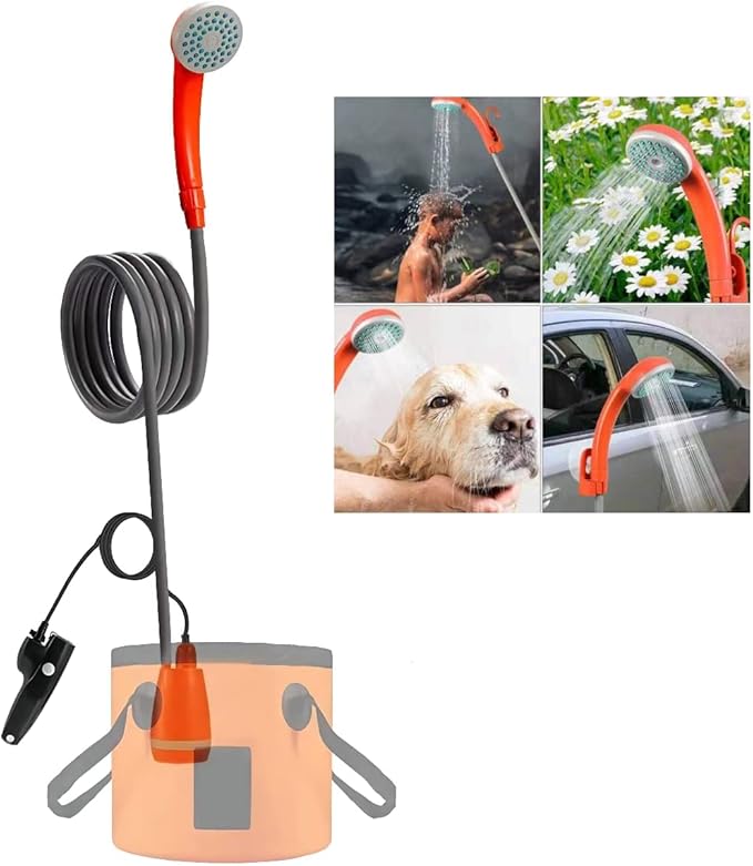 - 【Easy to Operate】 Attach pump and shower head to the hose. Immerse the pump completely in the water, then use the hook, bracket or suction cup provided to secure the shower before turning on the power. Finally the water is pumped up from bucket and you get a nice flowing shower.Scientific and beautiful design, easy disassembly, charging and cleaning.