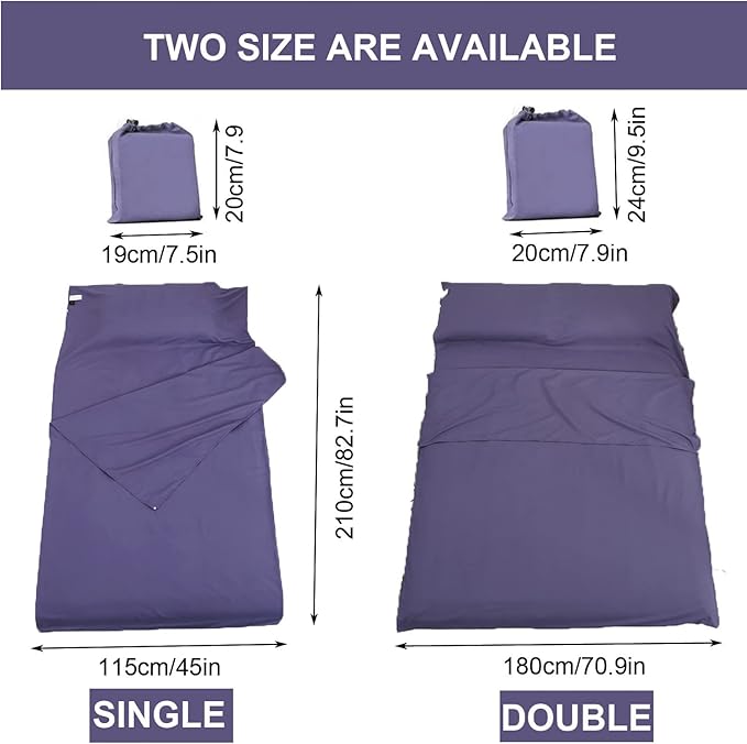 - PORTABLE TO CARRY:This lightweight and compact sleeping sack sheets is foldable, and the size after folding is 20x24cm (7.9x9.5"), only 2 lb (930g). Comes with a storage bag.You can storage it in your backpack. It will be your great travel and camping companion.