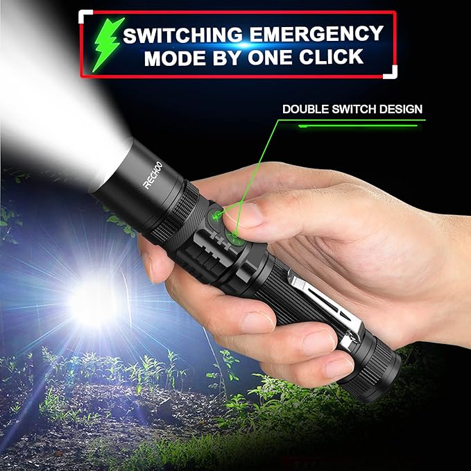 - Double Switch 5 Modes LED Flashlight: Advanced double switch design; The rechargeable flashlight is designed with an emergency button (Strobe / SOS) and a daily button (High / Medium / Low light); With one click to start emergency mode; A smart design for an emergency flashlight in case you get in trouble;