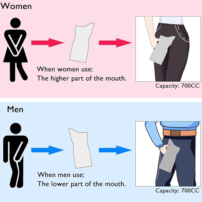 - 🌸Handy To Carry & Easy To Use: The disposal urine bag is lightweight and foldable, easily to slide in your purse, car pull-up down drawer, handbag or even in your pocket this fits too. It is easy to use, just open the pee bag and use it.